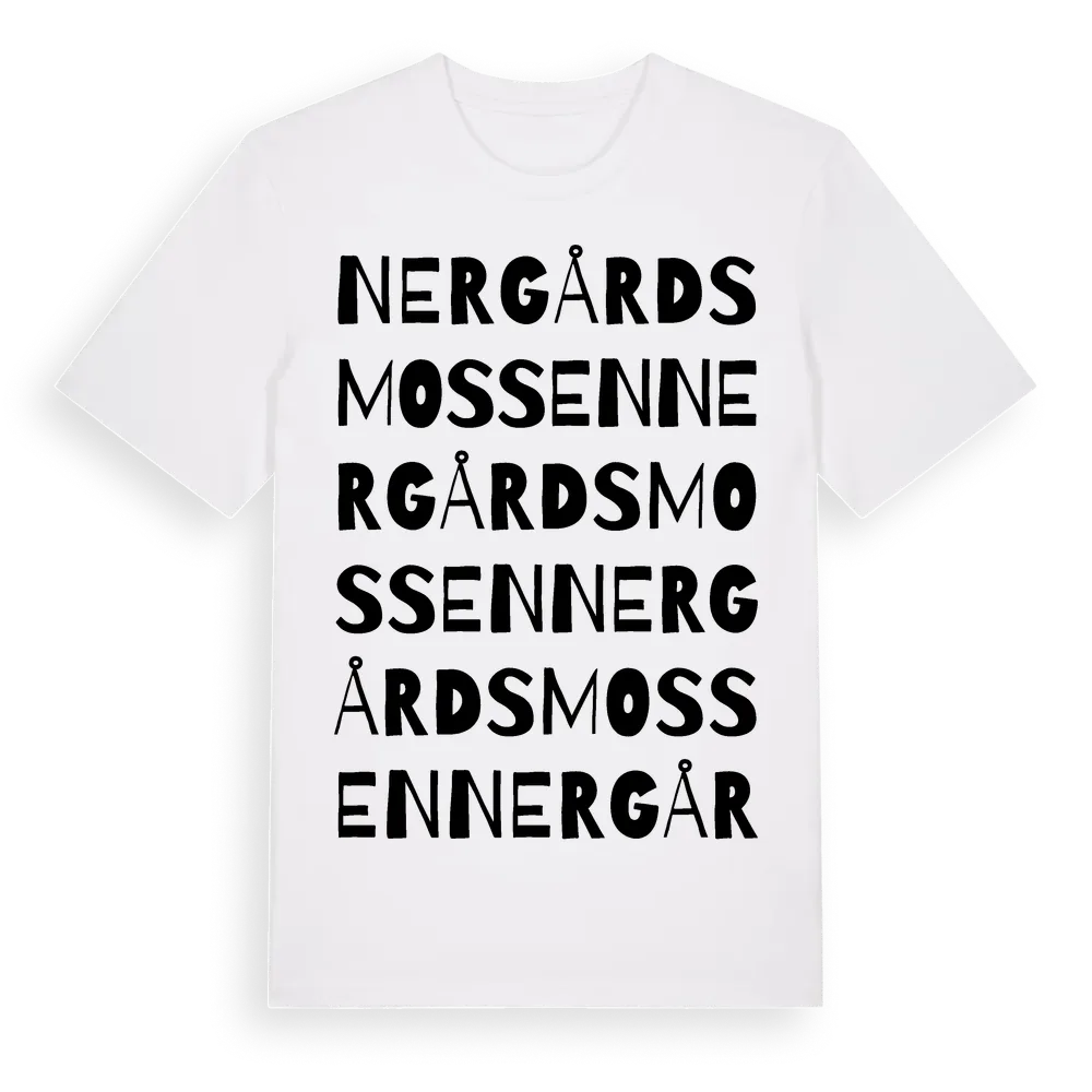 Nergårdsmossen ordlek t-shirt är inspirerad av Nergårdsmossen i Östergötlands län, Sverige. Tröjan är designad för dig som har en speciell koppling till platsen – oavsett om du bor här, har rötterna här eller bara älskar Nergårdsmossen.