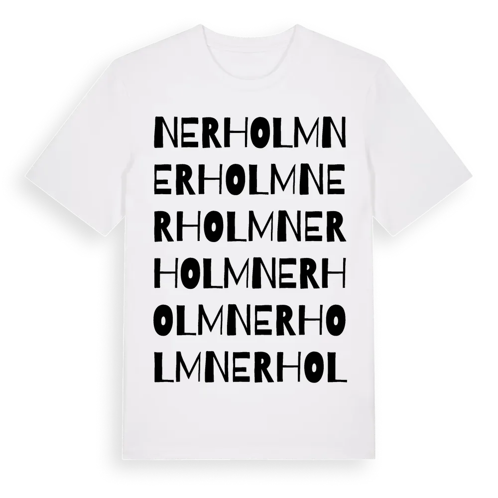 Nerholm ordlek t-shirt är inspirerad av Nerholm i Östergötlands län, Sverige. Tröjan är designad för dig som har en speciell koppling till platsen – oavsett om du bor här, har rötterna här eller bara älskar Nerholm.