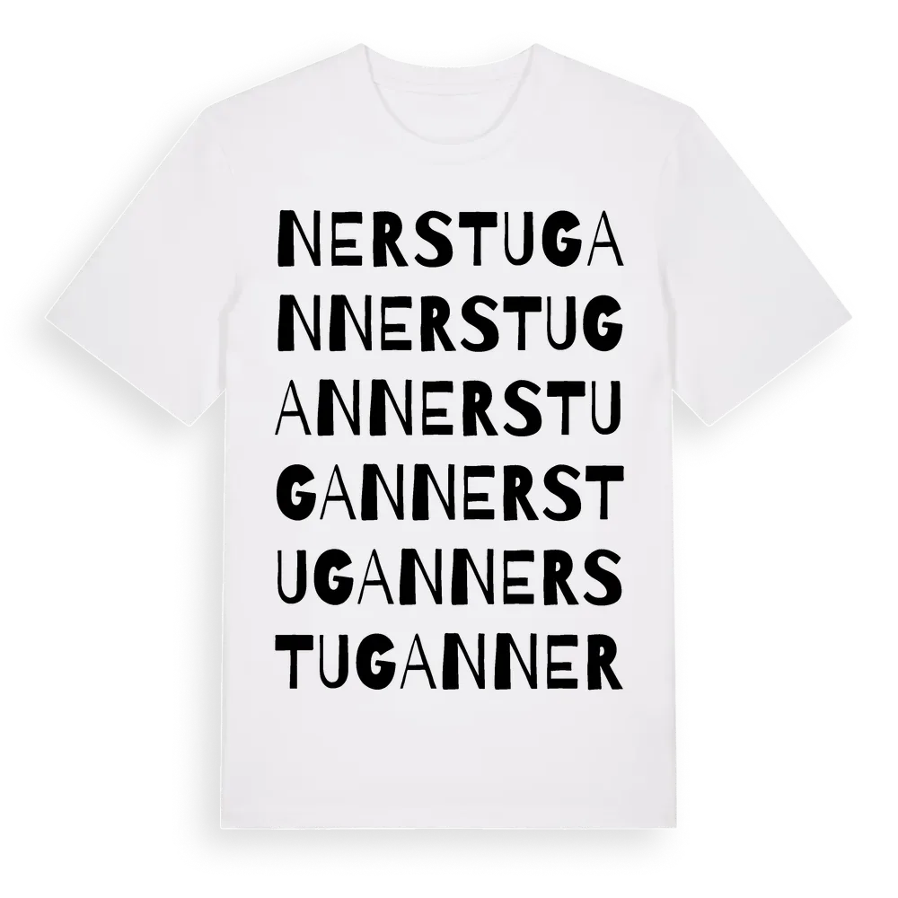 Nerstugan ordlek t-shirt är inspirerad av Nerstugan i Östergötlands län, Sverige. Tröjan är designad för dig som har en speciell koppling till platsen – oavsett om du bor här, har rötterna här eller bara älskar Nerstugan.