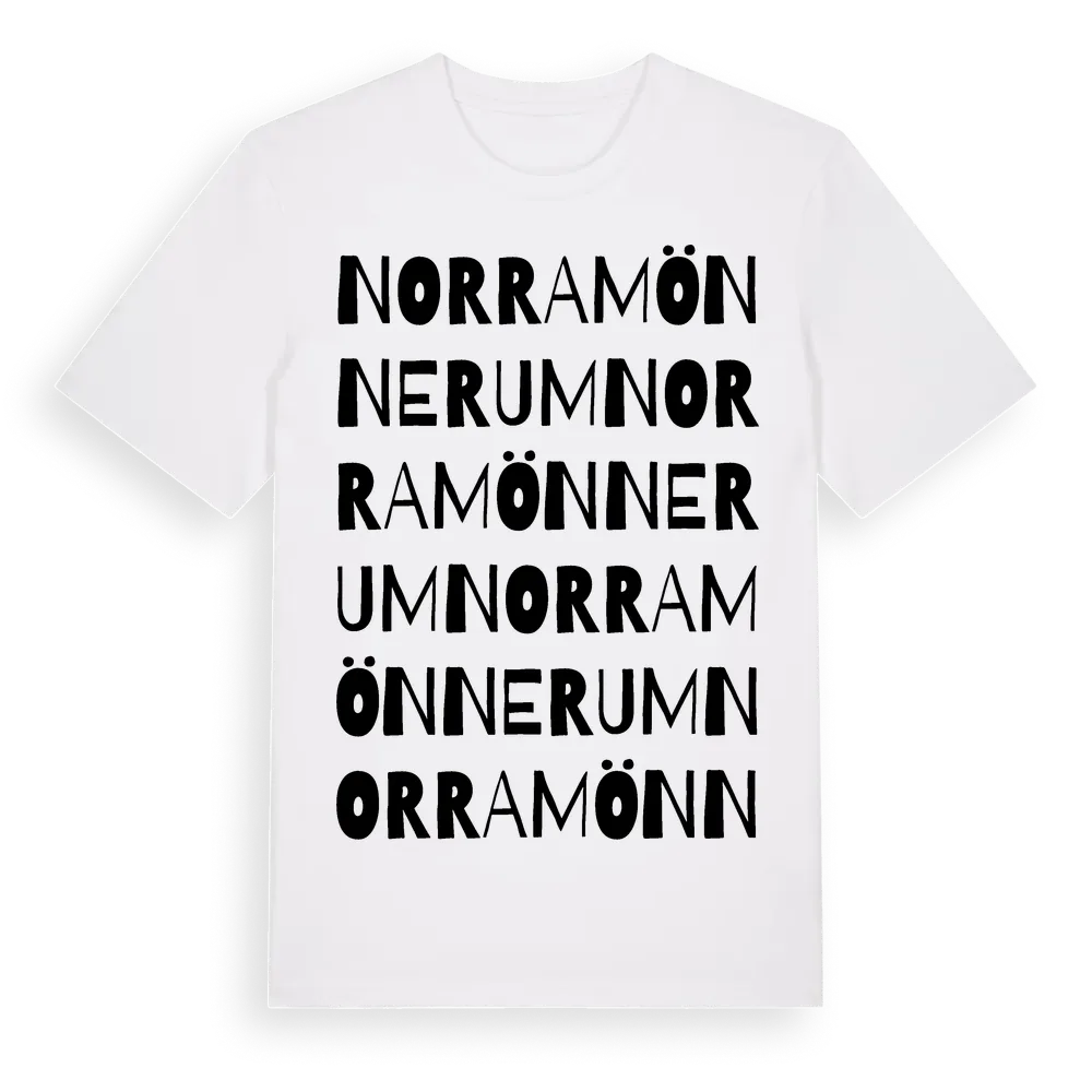 Norra Mönnerum ordlek t-shirt är inspirerad av Norra Mönnerum i Östergötlands län, Sverige. Tröjan är designad för dig som har en speciell koppling till platsen – oavsett om du bor här, har rötterna här eller bara älskar Norra Mönnerum.