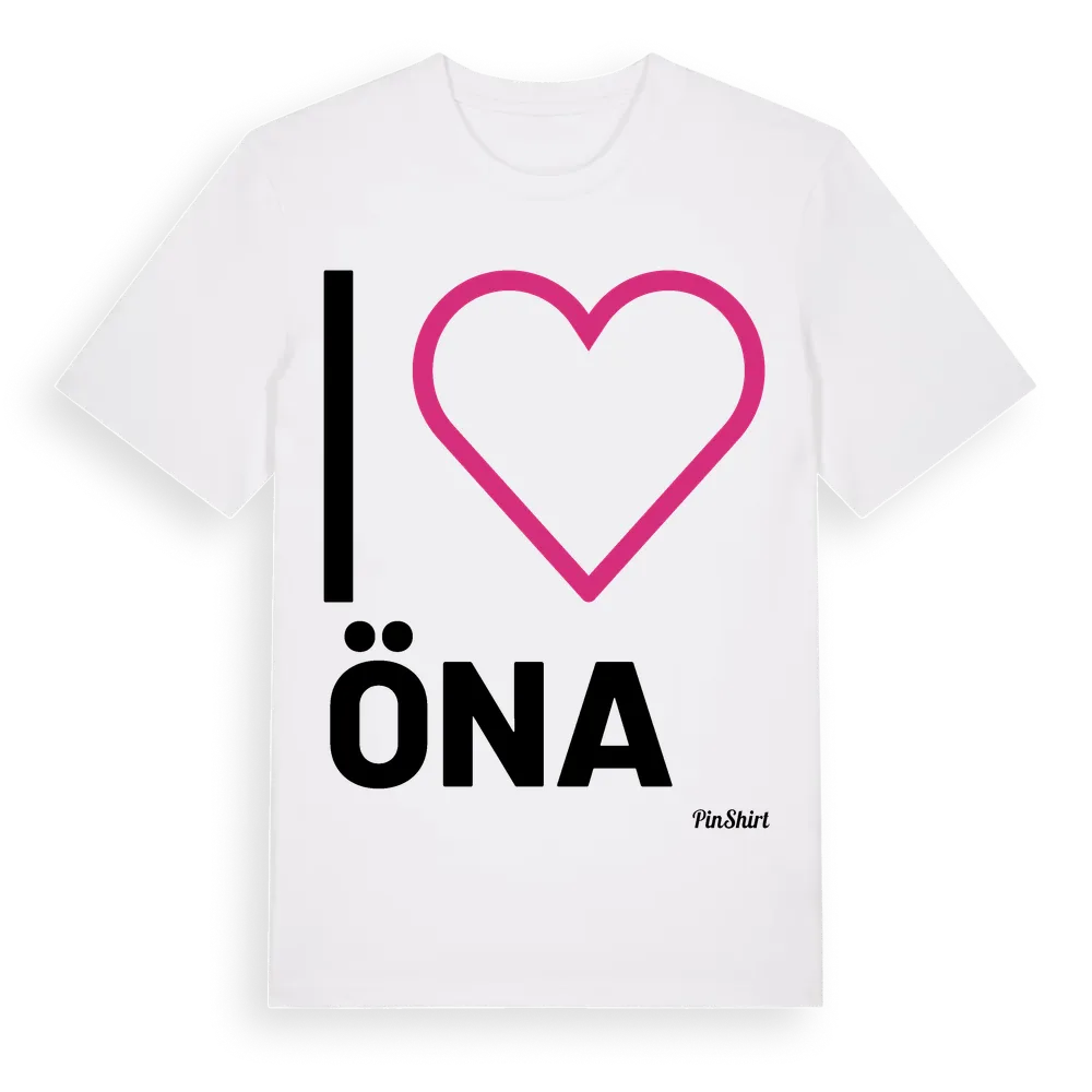Det klassiska "I ❤ Öna"-motivet i stort format som täcker hela bröstet. För dig som vill visa kärleken till Öna på riktigt. Premium bomull, unisex – från byn Öna i Östergötlands län.