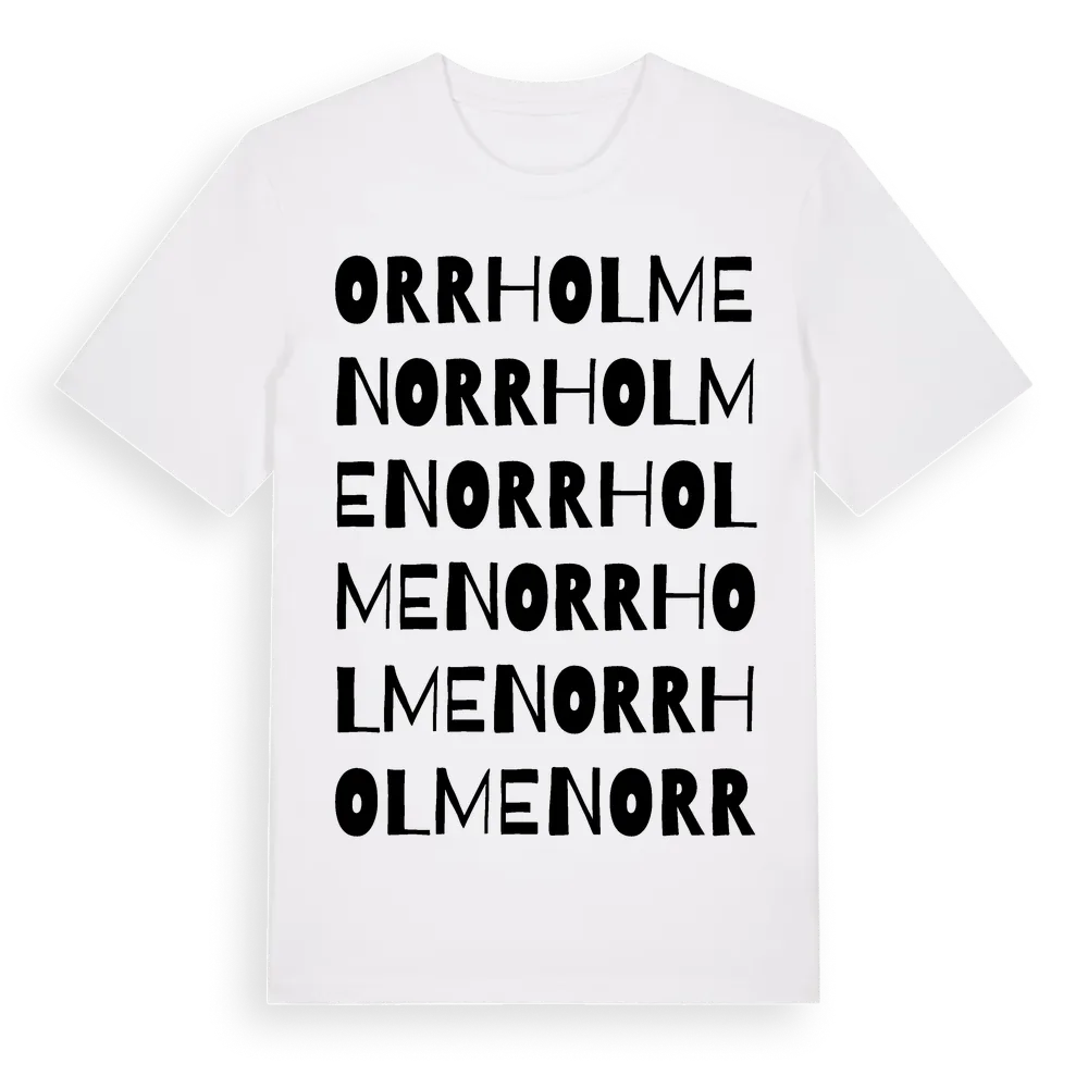 Orrholmen ordlek t-shirt är inspirerad av Orrholmen i Östergötlands län, Sverige. Tröjan är designad för dig som har en speciell koppling till platsen – oavsett om du bor här, har rötterna här eller bara älskar Orrholmen.