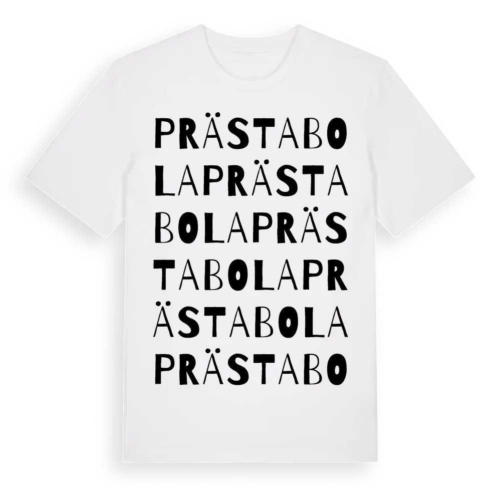 Prästabola ordlek t-shirt är inspirerad av Prästabola i Östergötlands län, Sverige. Tröjan är designad för dig som har en speciell koppling till platsen – oavsett om du bor här, har rötterna här eller bara älskar Prästabola.