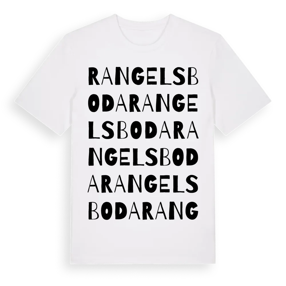 En ordlek byggd på Rangelsbodas namn. Subtilt och klurig – ett motiv som bara de som verkligen känner platsen fullt ut förstår. Premium bomull, unisex – från Rangelsboda i Östergötlands län.