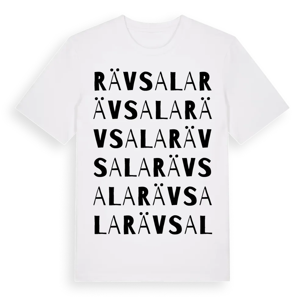 Rävsala ordlek t-shirt är inspirerad av byn Rävsala i Östergötlands län, Sverige. Tröjan är designad för dig som har en speciell koppling till platsen – oavsett om du bor här, har rötterna här eller bara älskar Rävsala.