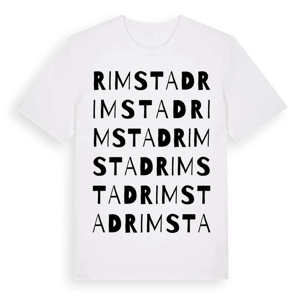 Rimstad ordlek t-shirt är inspirerad av byn Rimstad i Östergötlands län, Sverige. Tröjan är designad för dig som har en speciell koppling till platsen – oavsett om du bor här, har rötterna här eller bara älskar Rimstad.