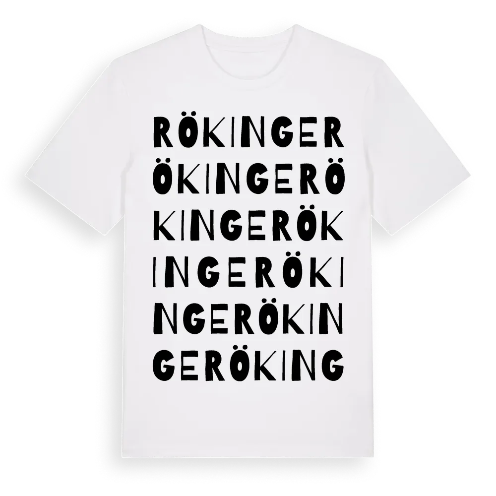 En ordlek byggd på Rökinges namn. Subtilt och klurig – ett motiv som bara de som verkligen känner platsen fullt ut förstår. Premium bomull, unisex – från Rökinge i Östergötlands län.