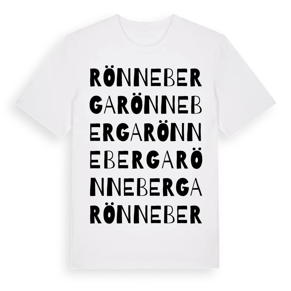 Rönneberga ordlek t-shirt är inspirerad av Rönneberga i Östergötlands län, Sverige. Tröjan är designad för dig som har en speciell koppling till platsen – oavsett om du bor här, har rötterna här eller bara älskar Rönneberga.
