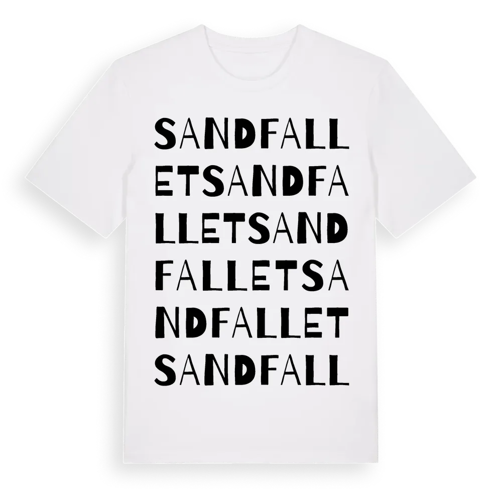 Sandfallet ordlek t-shirt är inspirerad av Sandfallet i Östergötlands län, Sverige. Tröjan är designad för dig som har en speciell koppling till platsen – oavsett om du bor här, har rötterna här eller bara älskar Sandfallet.