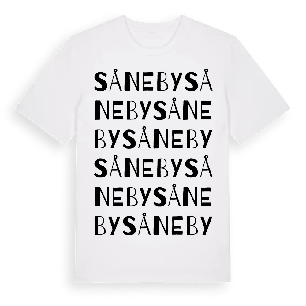 Såneby ordlek t-shirt är inspirerad av byn Såneby i Östergötlands län, Sverige. Tröjan är designad för dig som har en speciell koppling till platsen – oavsett om du bor här, har rötterna här eller bara älskar Såneby.