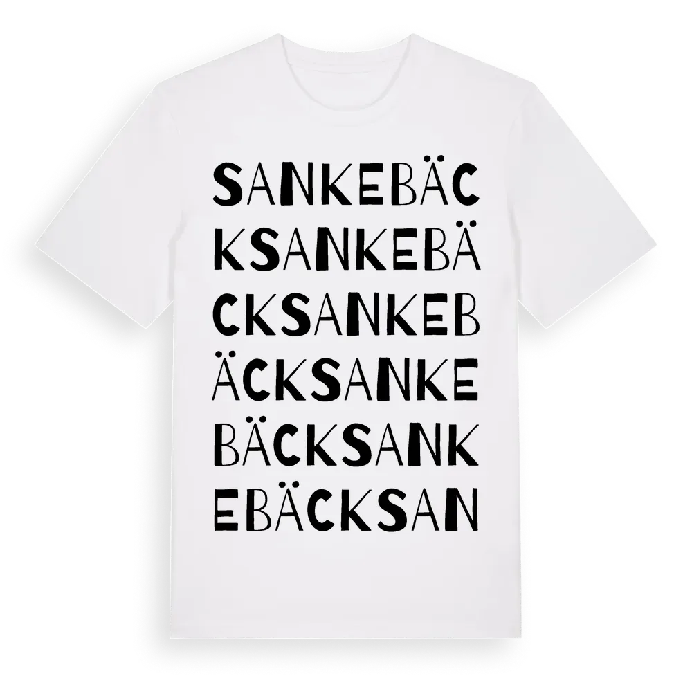 Sankebäck ordlek t-shirt är inspirerad av Sankebäck i Östergötlands län, Sverige. Tröjan är designad för dig som har en speciell koppling till platsen – oavsett om du bor här, har rötterna här eller bara älskar Sankebäck.