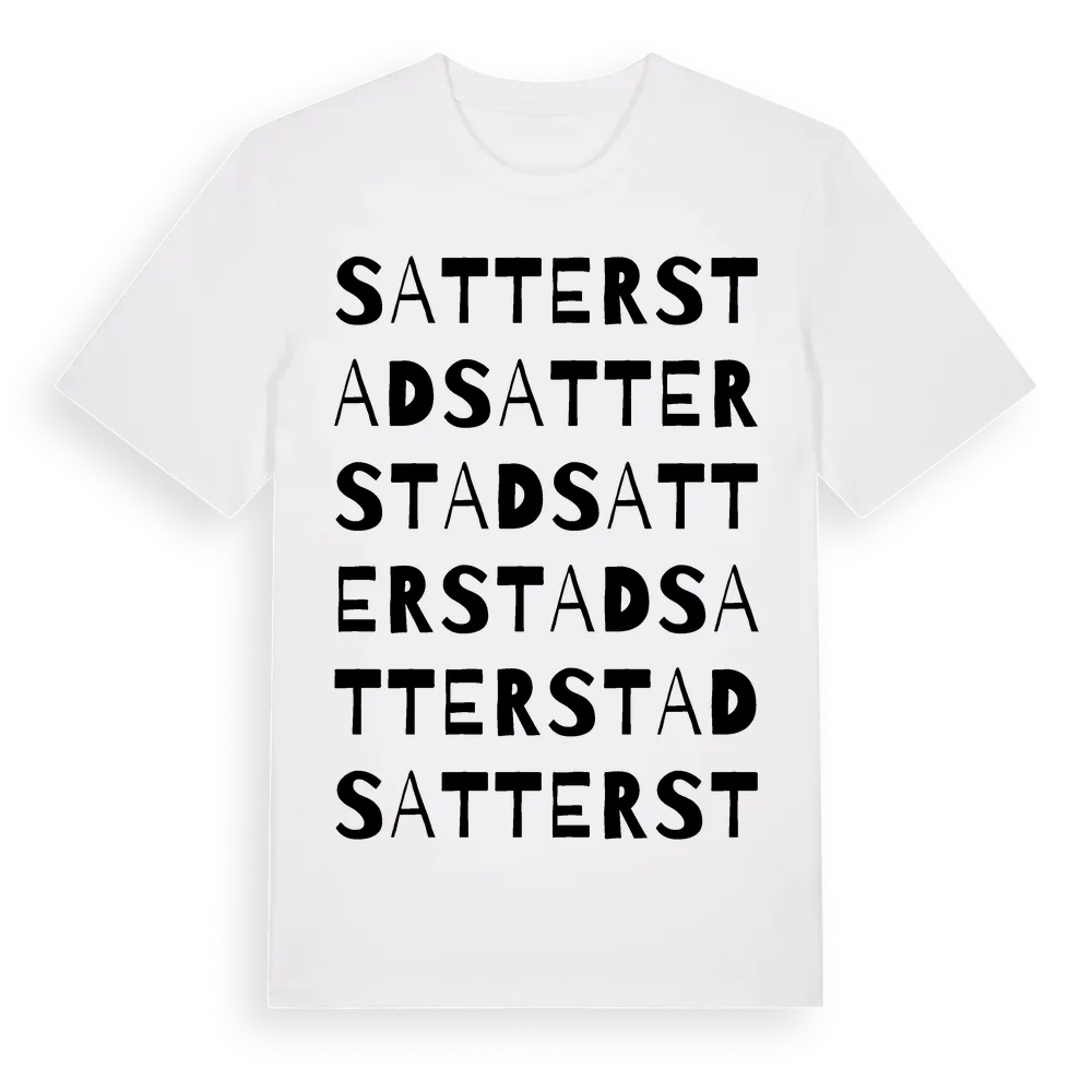 Satterstad ordlek t-shirt är inspirerad av byn Satterstad i Östergötlands län, Sverige. Tröjan är designad för dig som har en speciell koppling till platsen – oavsett om du bor här, har rötterna här eller bara älskar Satterstad.