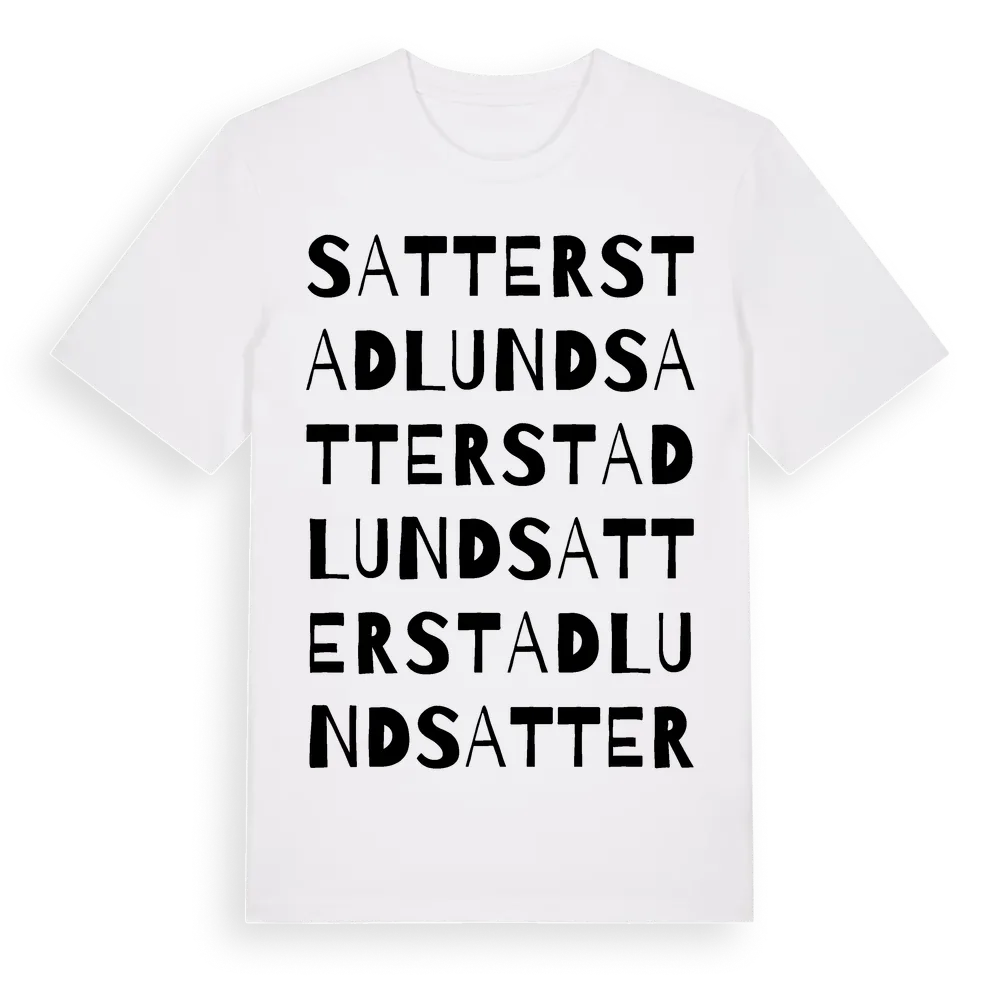 Satterstadlund ordlek t-shirt är inspirerad av Satterstadlund i Östergötlands län, Sverige. Tröjan är designad för dig som har en speciell koppling till platsen – oavsett om du bor här, har rötterna här eller bara älskar Satterstadlund.