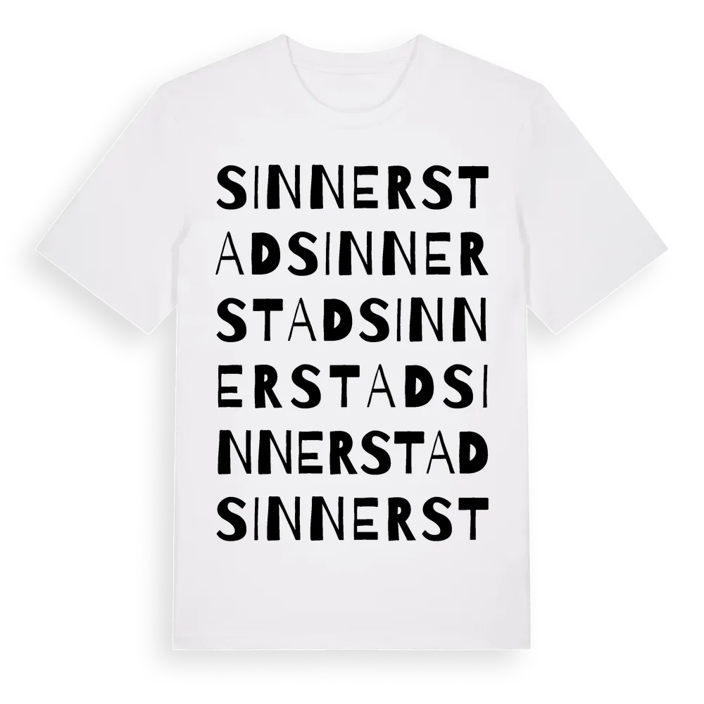 Sinnerstad ordlek t-shirt är inspirerad av Sinnerstad i Östergötlands län, Sverige. Tröjan är designad för dig som har en speciell koppling till platsen – oavsett om du bor här, har rötterna här eller bara älskar Sinnerstad.