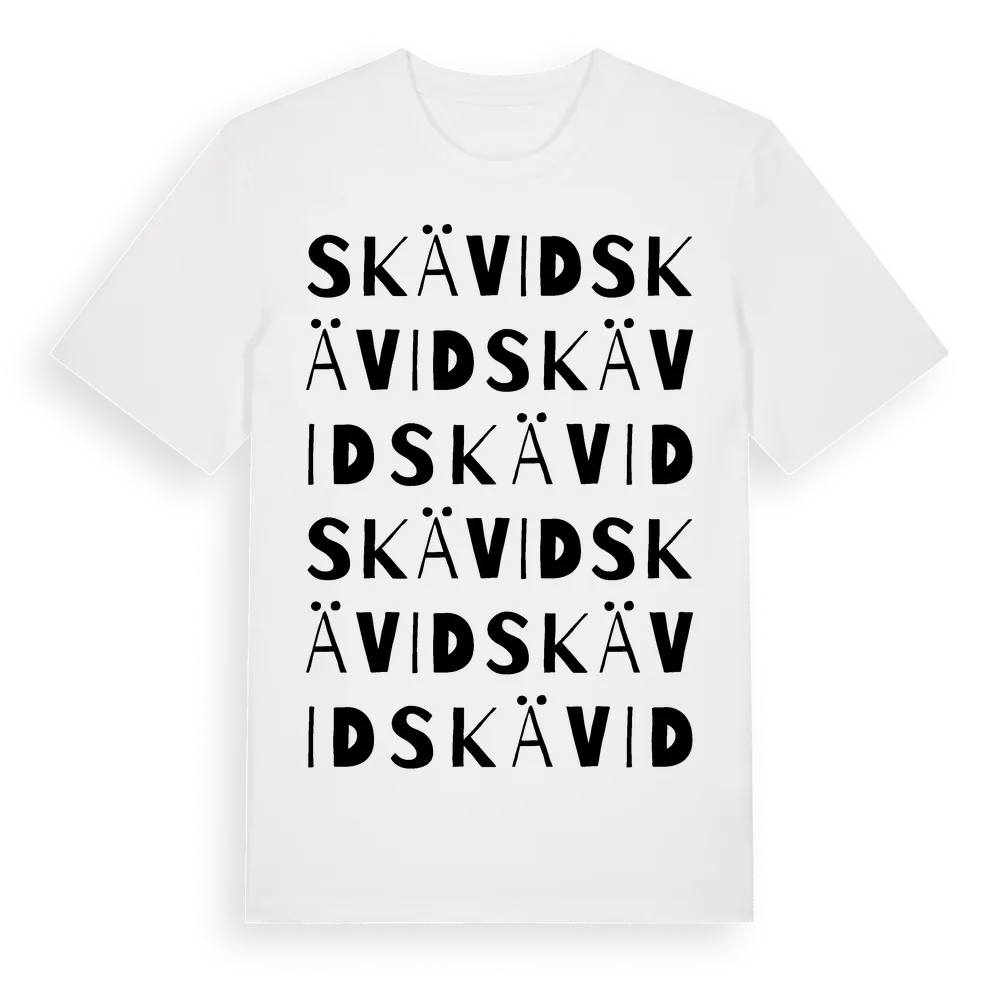 Skävid ordlek t-shirt är inspirerad av byn Skävid i Östergötlands län, Sverige. Tröjan är designad för dig som har en speciell koppling till platsen – oavsett om du bor här, har rötterna här eller bara älskar Skävid.