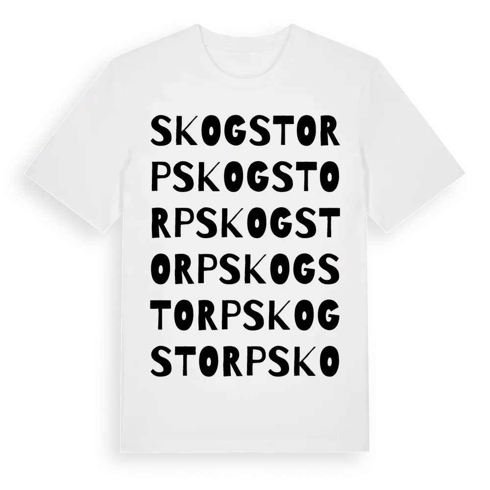 Skogstorp ordlek t-shirt är inspirerad av Skogstorp i Östergötlands län, Sverige. Tröjan är designad för dig som har en speciell koppling till platsen – oavsett om du bor här, har rötterna här eller bara älskar Skogstorp.