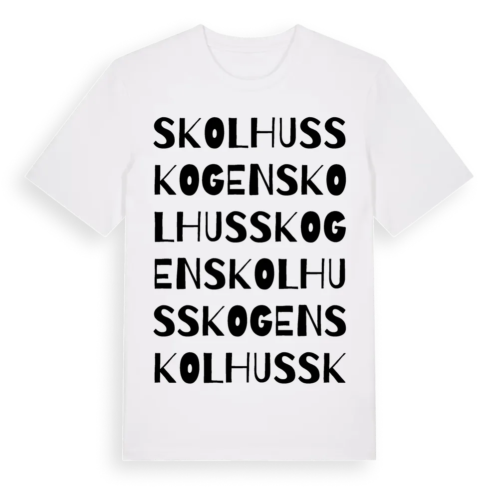 Skolhusskogen ordlek t-shirt är inspirerad av Skolhusskogen i Östergötlands län, Sverige. Tröjan är designad för dig som har en speciell koppling till platsen – oavsett om du bor här, har rötterna här eller bara älskar Skolhusskogen.