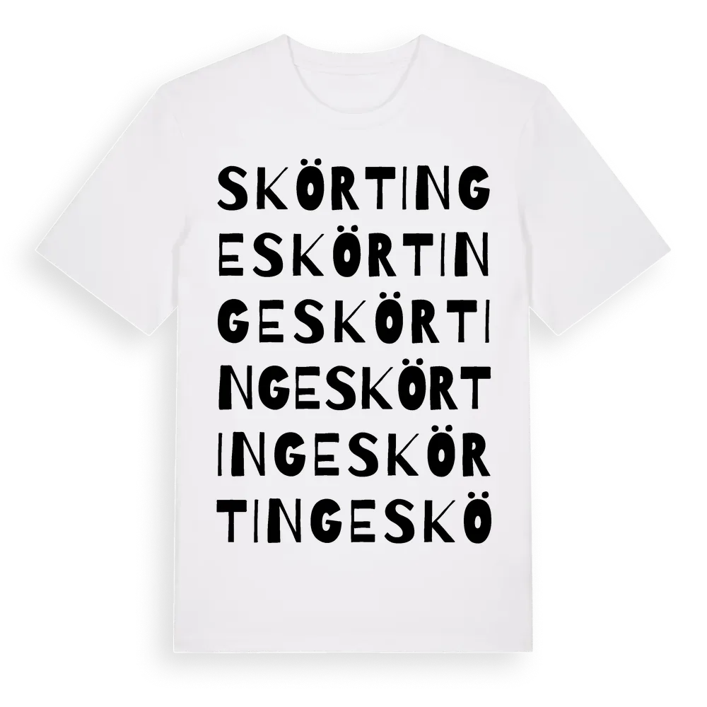 En ordlek byggd på Skörtinges namn. Subtilt och klurig – ett motiv som bara de som verkligen känner platsen fullt ut förstår. Premium bomull, unisex – från Skörtinge i Östergötlands län.