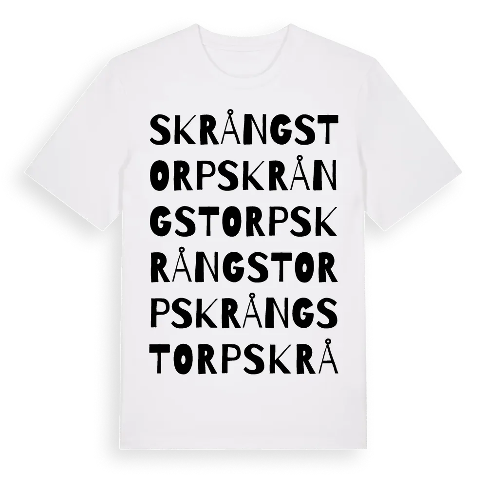 Skrångstorp ordlek t-shirt är inspirerad av Skrångstorp i Östergötlands län, Sverige. Tröjan är designad för dig som har en speciell koppling till platsen – oavsett om du bor här, har rötterna här eller bara älskar Skrångstorp.