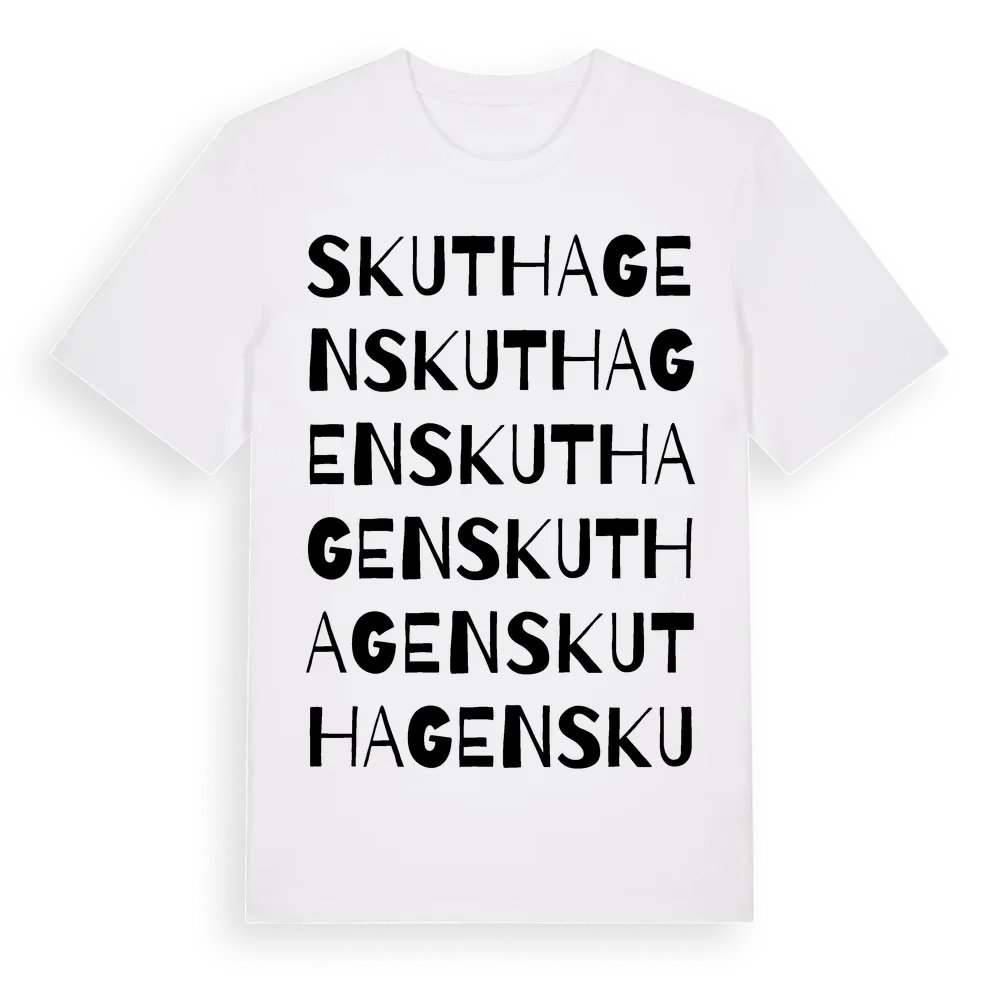 Skuthagen ordlek t-shirt är inspirerad av Skuthagen i Östergötlands län, Sverige. Tröjan är designad för dig som har en speciell koppling till platsen – oavsett om du bor här, har rötterna här eller bara älskar Skuthagen.