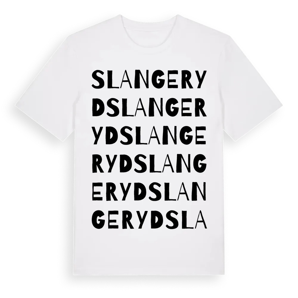 Slangeryd ordlek t-shirt är inspirerad av byn Slangeryd i Östergötlands län, Sverige. Tröjan är designad för dig som har en speciell koppling till platsen – oavsett om du bor här, har rötterna här eller bara älskar Slangeryd.