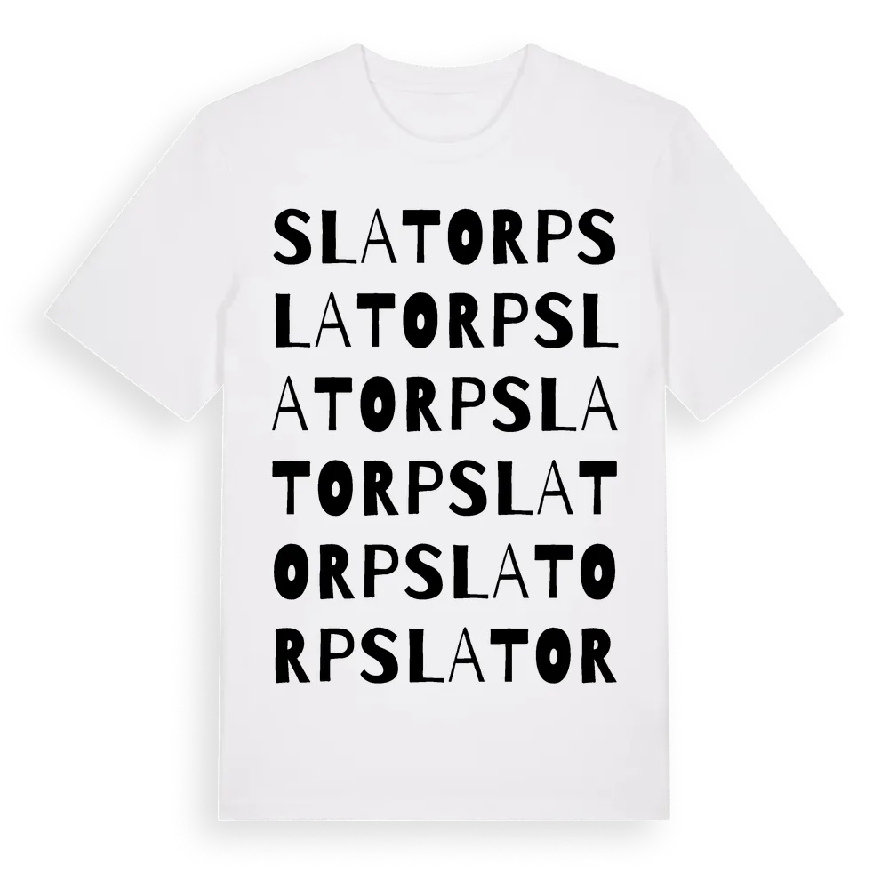 En ordlek byggd på Slatorps namn. Subtilt och klurig – ett motiv som bara de som verkligen känner platsen fullt ut förstår. Premium bomull, unisex – från byn Slatorp i Östergötlands län.