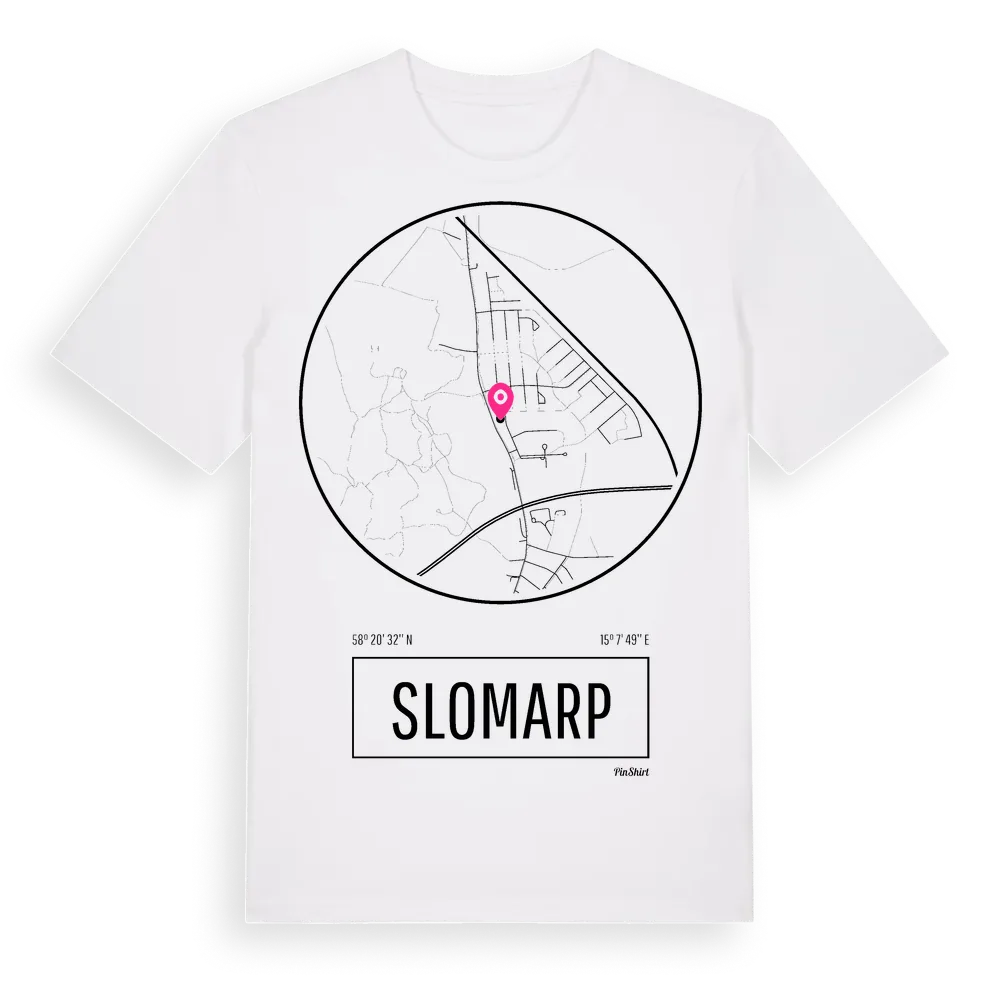 Ett rent, runt tryck med Slomarps namn. Minimalistiskt och stilrent – perfekt för den som känner platsen utan att skrika det. Premium bomull, unisex – från stadsdelen Slomarp i Östergötlands län.