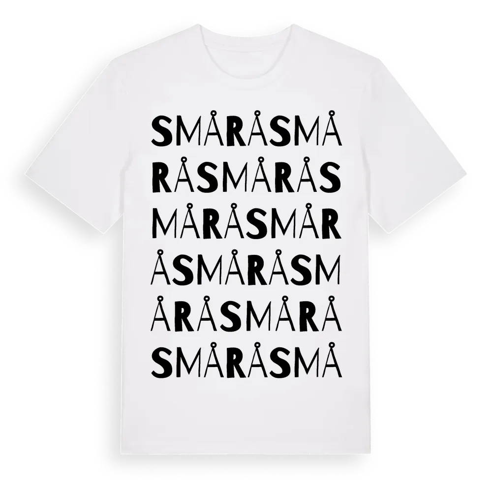 Smårå ordlek t-shirt är inspirerad av Smårå i Östergötlands län, Sverige. Tröjan är designad för dig som har en speciell koppling till platsen – oavsett om du bor här, har rötterna här eller bara älskar Smårå.