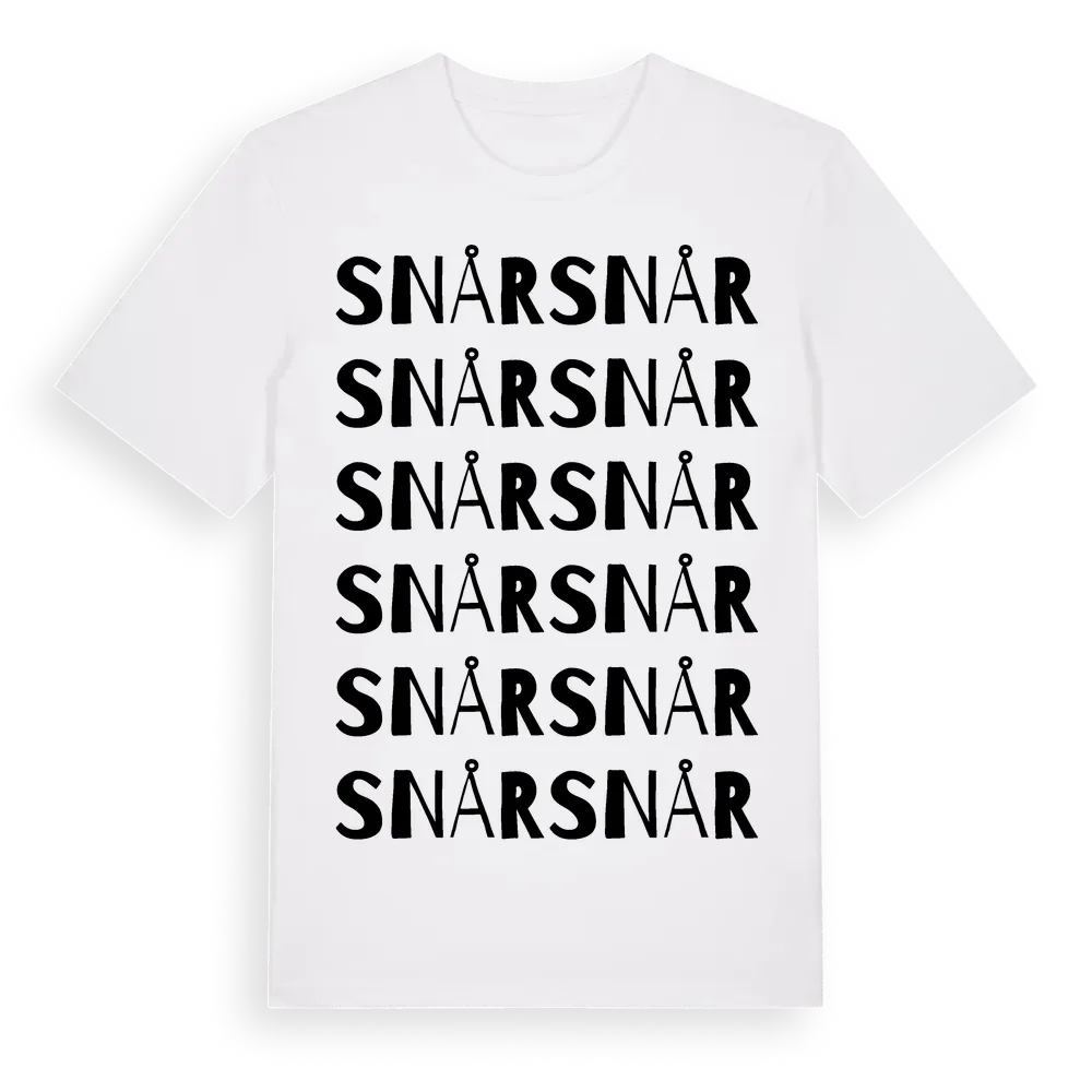 Snår ordlek t-shirt är inspirerad av Snår i Östergötlands län, Sverige. Tröjan är designad för dig som har en speciell koppling till platsen – oavsett om du bor här, har rötterna här eller bara älskar Snår.
