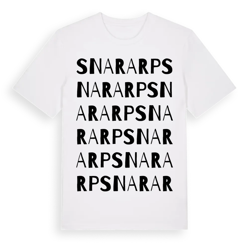 En ordlek byggd på Snararps namn. Subtilt och klurig – ett motiv som bara de som verkligen känner platsen fullt ut förstår. Premium bomull, unisex – från Snararp i Östergötlands län.