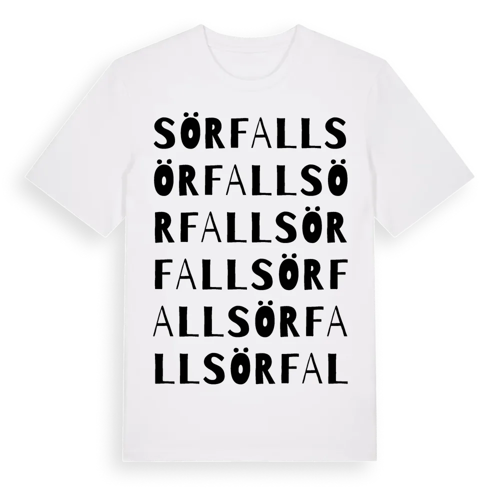 Sörfall ordlek t-shirt är inspirerad av Sörfall i Östergötlands län, Sverige. Tröjan är designad för dig som har en speciell koppling till platsen – oavsett om du bor här, har rötterna här eller bara älskar Sörfall.