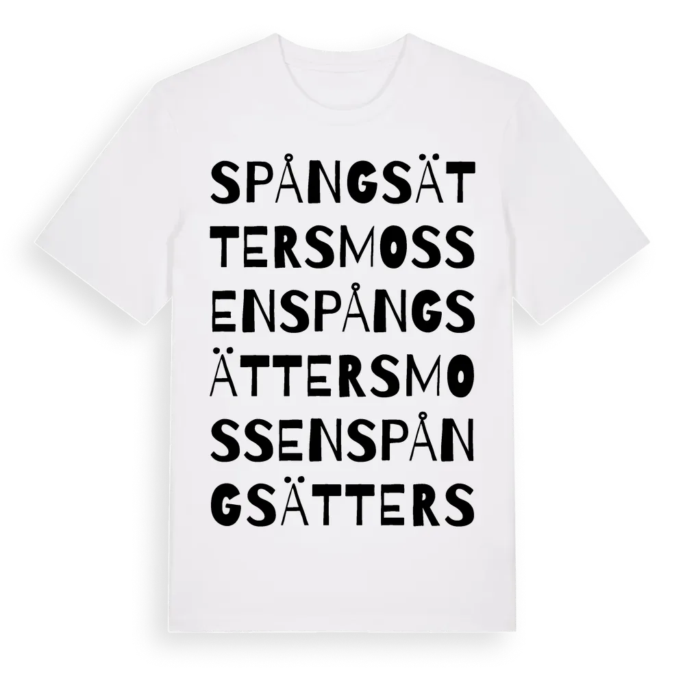 Spångsättersmossen ordlek t-shirt är inspirerad av Spångsättersmossen i Östergötlands län, Sverige. Tröjan är designad för dig som har en speciell koppling till platsen – oavsett om du bor här, har rötterna här eller bara älskar Spångsättersmossen.