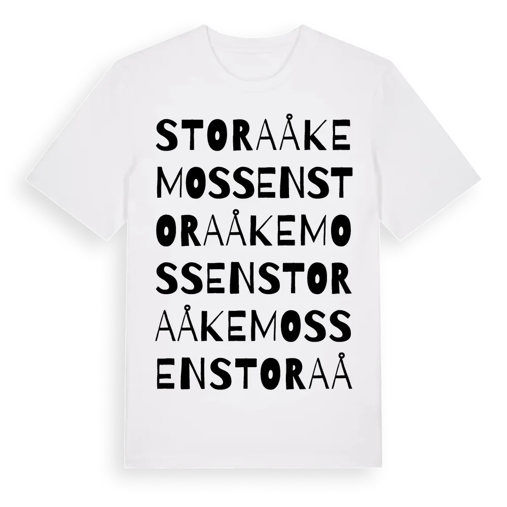 Stora Åkemossen ordlek t-shirt är inspirerad av Stora Åkemossen i Östergötlands län, Sverige. Tröjan är designad för dig som har en speciell koppling till platsen – oavsett om du bor här, har rötterna här eller bara älskar Stora Åkemossen.