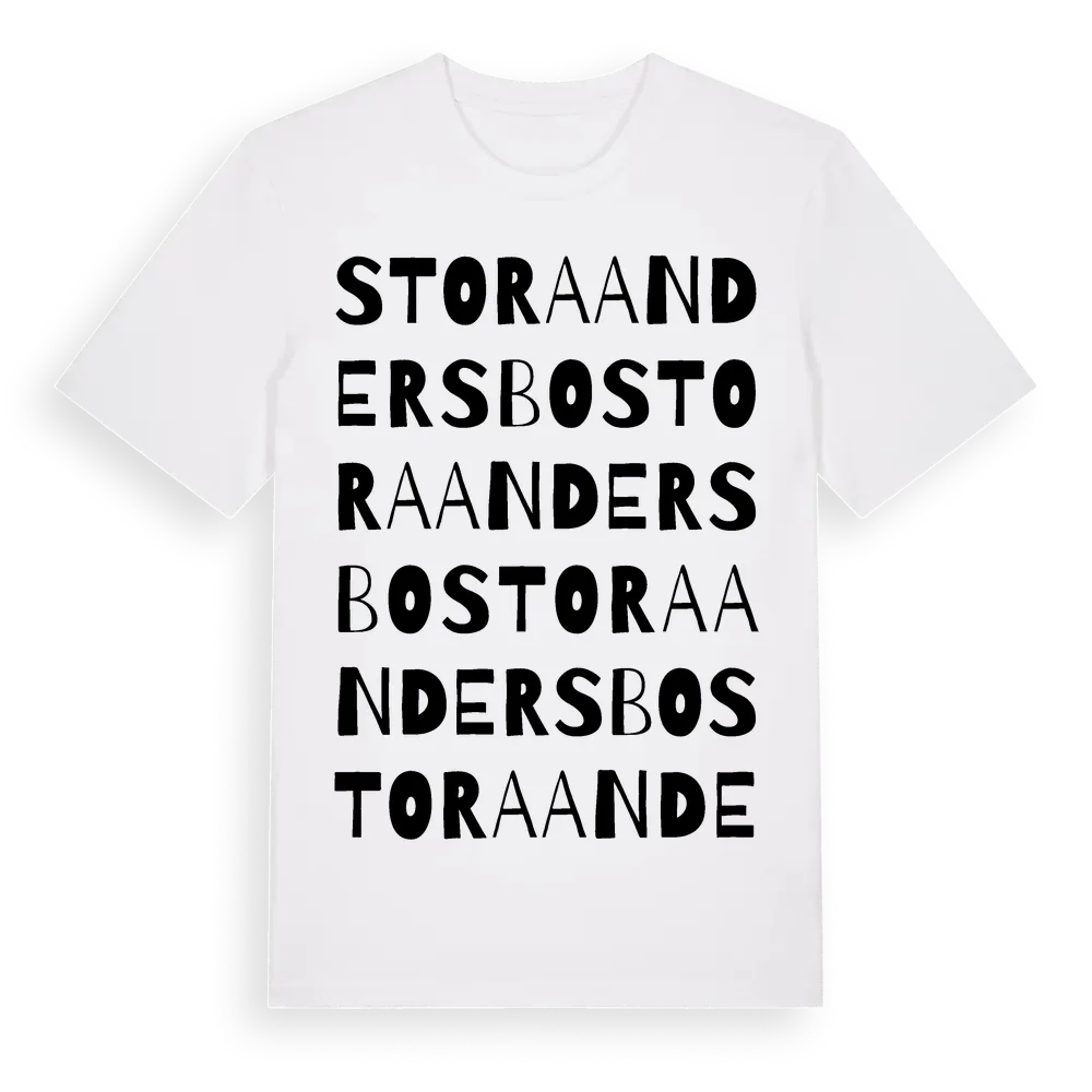 Stora Andersbo ordlek t-shirt är inspirerad av Stora Andersbo i Östergötlands län, Sverige. Tröjan är designad för dig som har en speciell koppling till platsen – oavsett om du bor här, har rötterna här eller bara älskar Stora Andersbo.