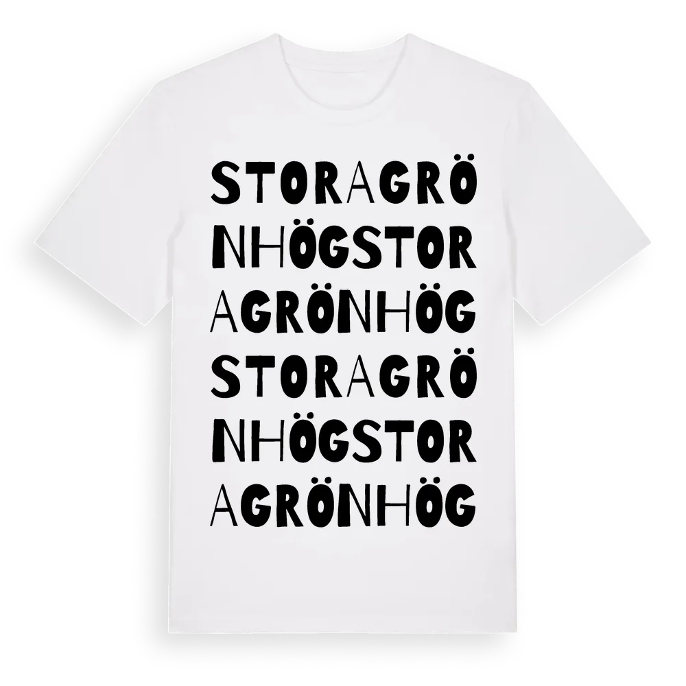 Stora Grönhög ordlek t-shirt är inspirerad av byn Stora Grönhög i Östergötlands län, Sverige. Tröjan är designad för dig som har en speciell koppling till platsen – oavsett om du bor här, har rötterna här eller bara älskar Stora Grönhög.