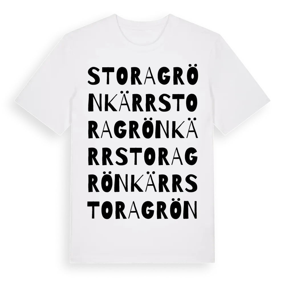 Stora Grönkärr ordlek t-shirt är inspirerad av Stora Grönkärr i Östergötlands län, Sverige. Tröjan är designad för dig som har en speciell koppling till platsen – oavsett om du bor här, har rötterna här eller bara älskar Stora Grönkärr.