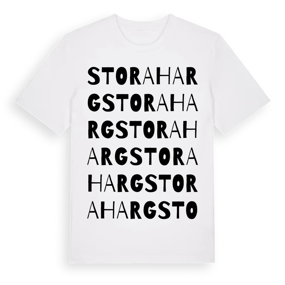 Stora Harg ordlek t-shirt är inspirerad av byn Stora Harg i Östergötlands län, Sverige. Tröjan är designad för dig som har en speciell koppling till platsen – oavsett om du bor här, har rötterna här eller bara älskar Stora Harg.