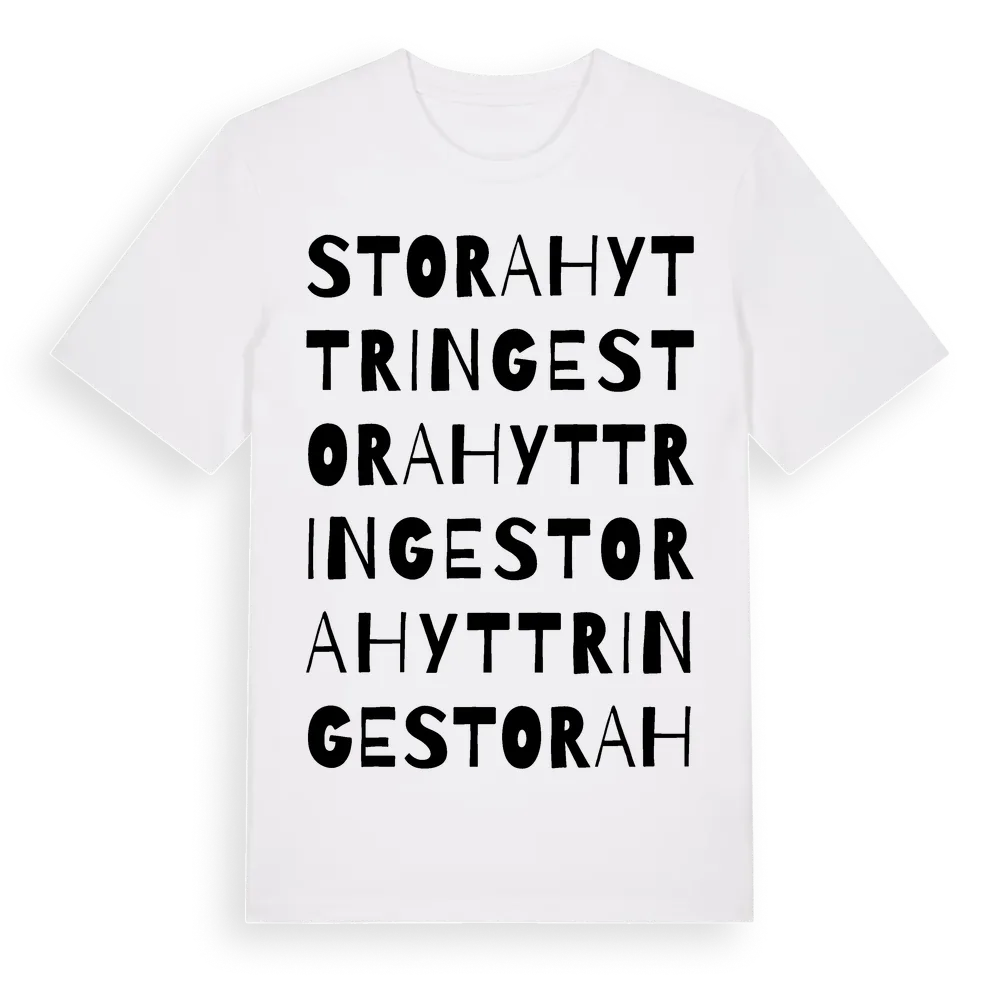 Stora Hyttringe ordlek t-shirt är inspirerad av Stora Hyttringe i Östergötlands län, Sverige. Tröjan är designad för dig som har en speciell koppling till platsen – oavsett om du bor här, har rötterna här eller bara älskar Stora Hyttringe.