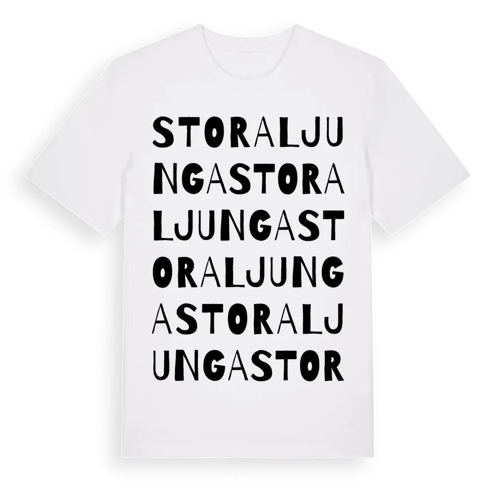 Stora Ljunga ordlek t-shirt är inspirerad av byn Stora Ljunga i Östergötlands län, Sverige. Tröjan är designad för dig som har en speciell koppling till platsen – oavsett om du bor här, har rötterna här eller bara älskar Stora Ljunga.