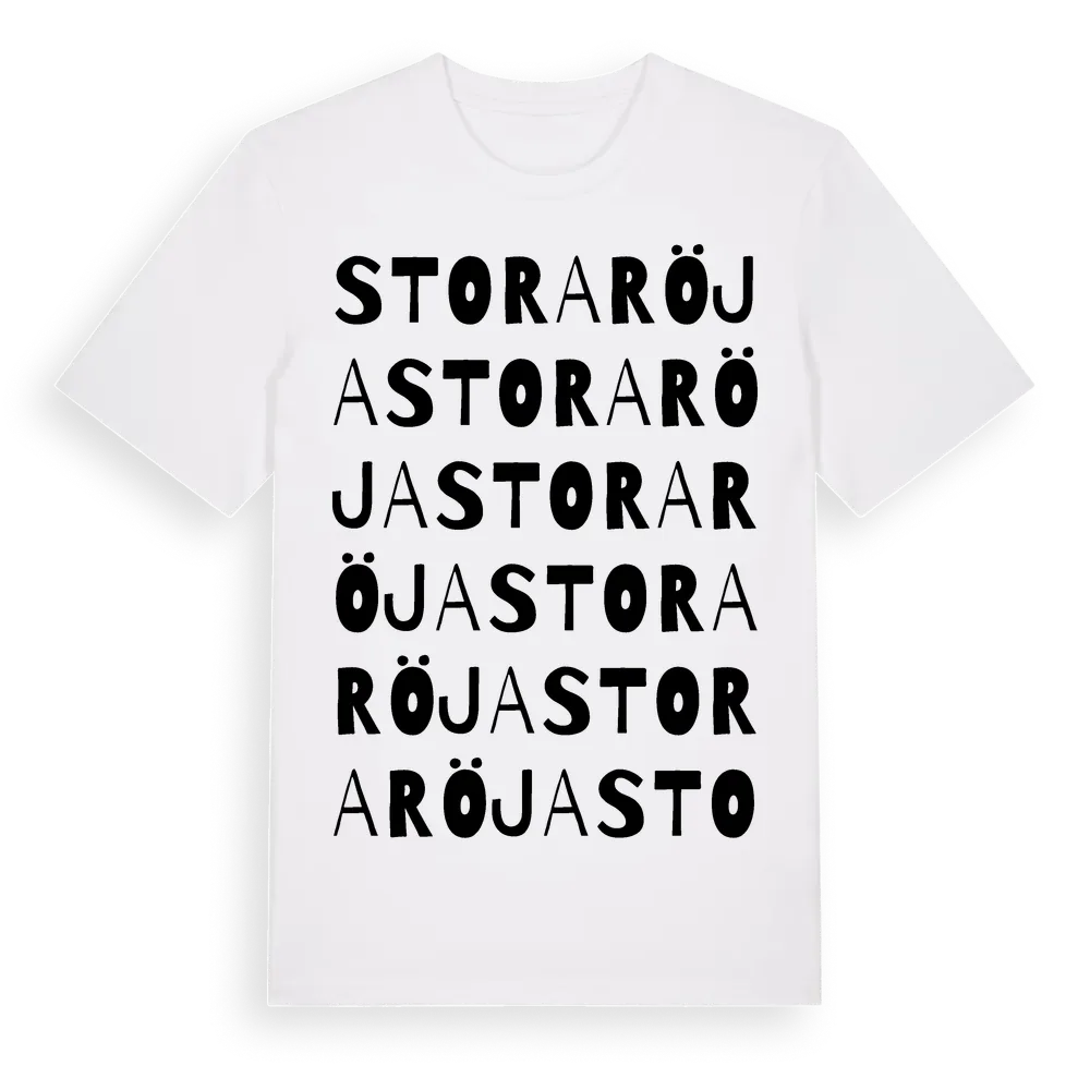 Stora Röja ordlek t-shirt är inspirerad av Stora Röja i Östergötlands län, Sverige. Tröjan är designad för dig som har en speciell koppling till platsen – oavsett om du bor här, har rötterna här eller bara älskar Stora Röja.