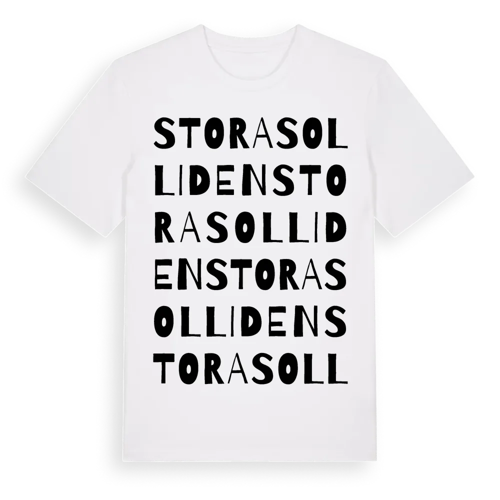 Stora Solliden ordlek t-shirt är inspirerad av Stora Solliden i Östergötlands län, Sverige. Tröjan är designad för dig som har en speciell koppling till platsen – oavsett om du bor här, har rötterna här eller bara älskar Stora Solliden.