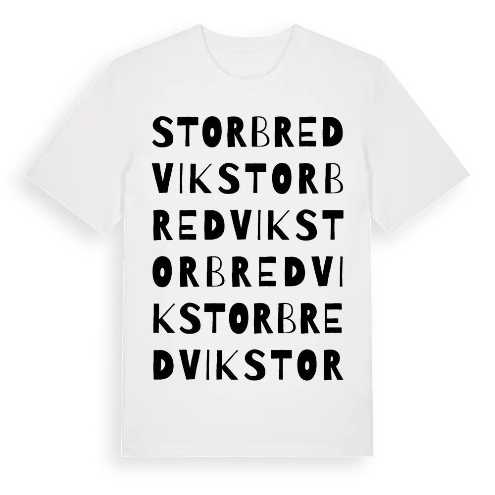 Storbredvik ordlek t-shirt är inspirerad av Storbredvik i Östergötlands län, Sverige. Tröjan är designad för dig som har en speciell koppling till platsen – oavsett om du bor här, har rötterna här eller bara älskar Storbredvik.