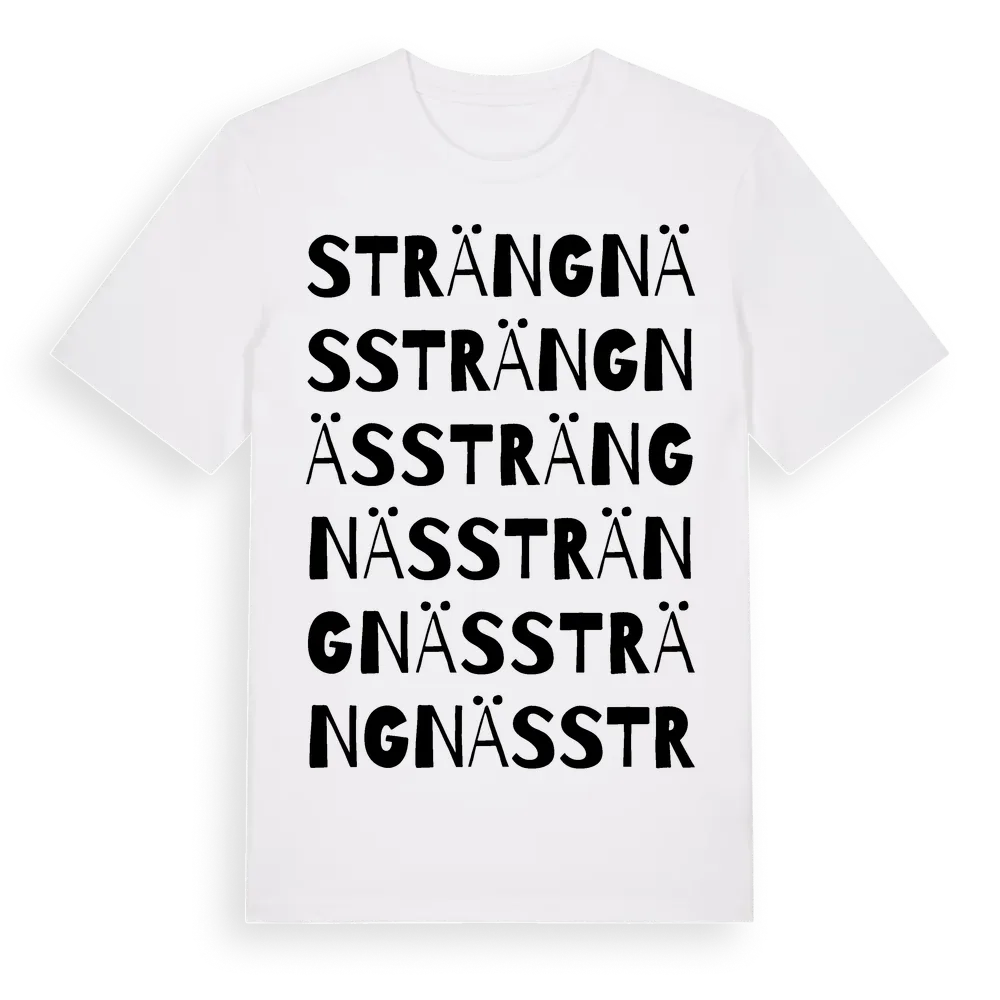 En ordlek byggd på Strängnäss namn. Subtilt och klurig – ett motiv som bara de som verkligen känner platsen fullt ut förstår. Premium bomull, unisex – från Strängnäs i Östergötlands län.