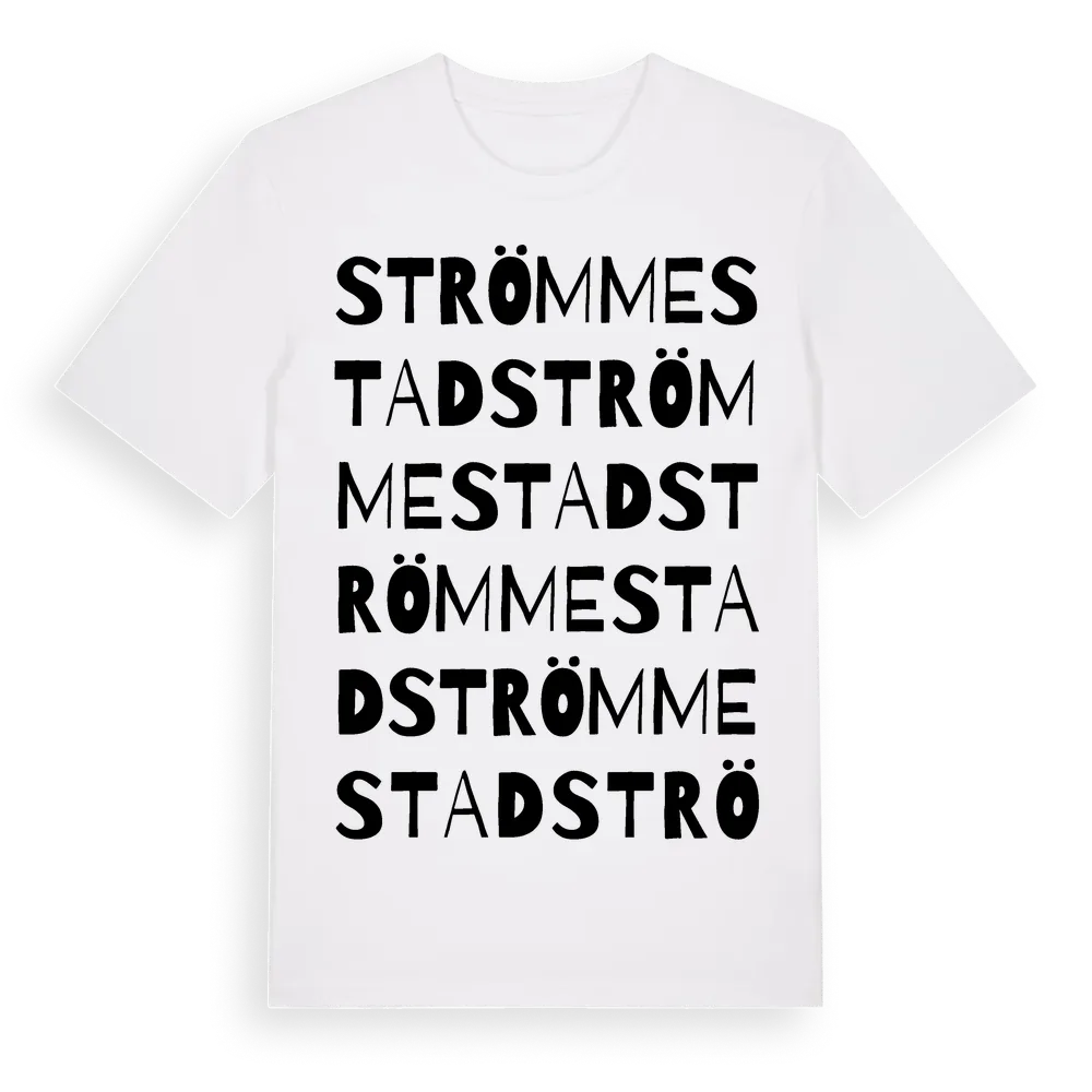 Strömmestad ordlek t-shirt är inspirerad av Strömmestad i Östergötlands län, Sverige. Tröjan är designad för dig som har en speciell koppling till platsen – oavsett om du bor här, har rötterna här eller bara älskar Strömmestad.