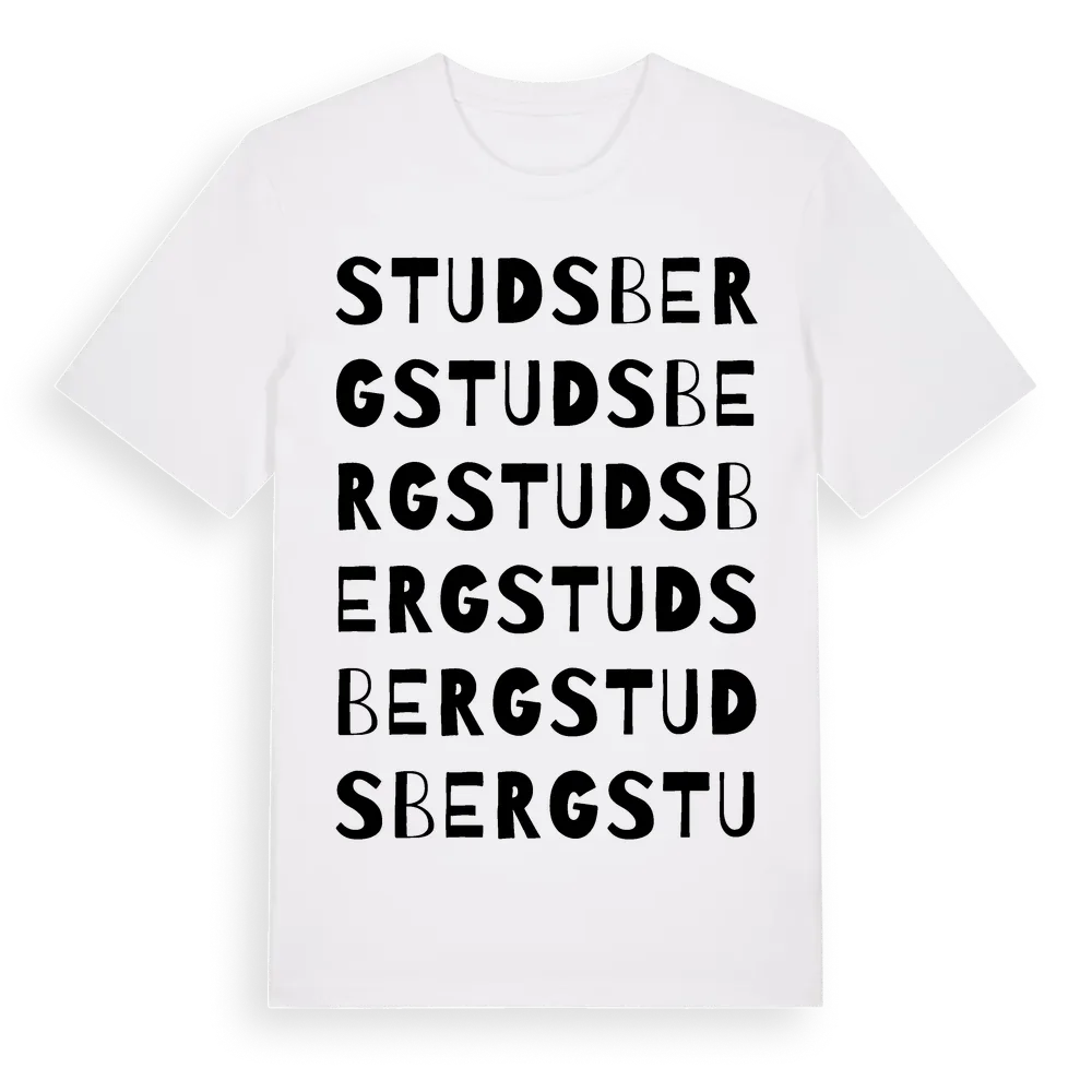 Studsberg ordlek t-shirt är inspirerad av byn Studsberg i Östergötlands län, Sverige. Tröjan är designad för dig som har en speciell koppling till platsen – oavsett om du bor här, har rötterna här eller bara älskar Studsberg.