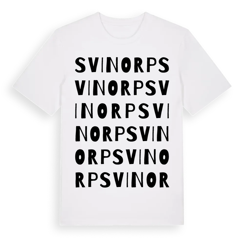 Svinorp ordlek t-shirt är inspirerad av Svinorp i Östergötlands län, Sverige. Tröjan är designad för dig som har en speciell koppling till platsen – oavsett om du bor här, har rötterna här eller bara älskar Svinorp.