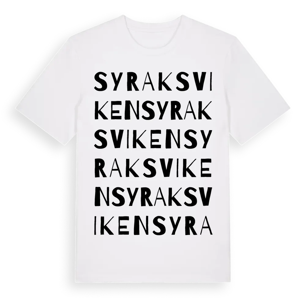 Syraksviken ordlek t-shirt är inspirerad av Syraksviken i Östergötlands län, Sverige. Tröjan är designad för dig som har en speciell koppling till platsen – oavsett om du bor här, har rötterna här eller bara älskar Syraksviken.