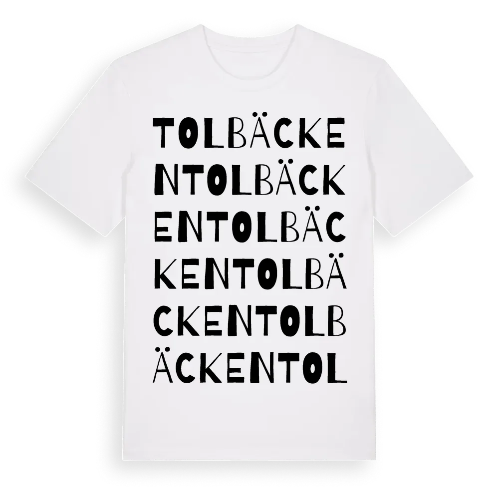 Tolbäcken ordlek t-shirt är inspirerad av Tolbäcken i Östergötlands län, Sverige. Tröjan är designad för dig som har en speciell koppling till platsen – oavsett om du bor här, har rötterna här eller bara älskar Tolbäcken.