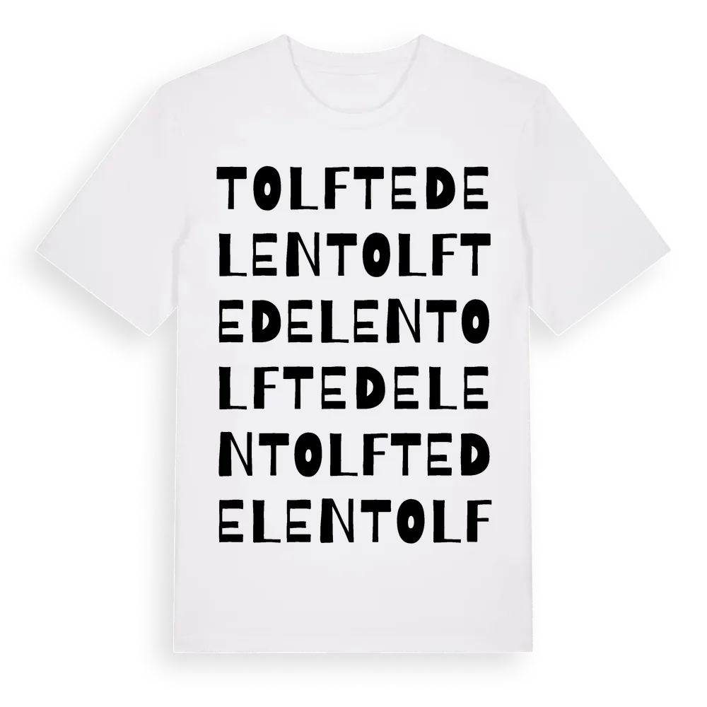 Tolftedelen ordlek t-shirt är inspirerad av Tolftedelen i Östergötlands län, Sverige. Tröjan är designad för dig som har en speciell koppling till platsen – oavsett om du bor här, har rötterna här eller bara älskar Tolftedelen.