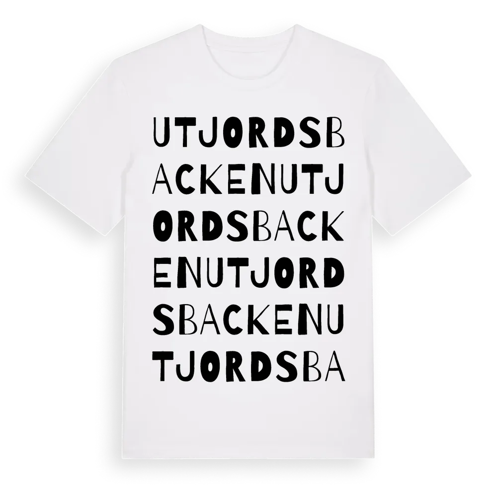 Utjordsbacken ordlek t-shirt är inspirerad av Utjordsbacken i Östergötlands län, Sverige. Tröjan är designad för dig som har en speciell koppling till platsen – oavsett om du bor här, har rötterna här eller bara älskar Utjordsbacken.